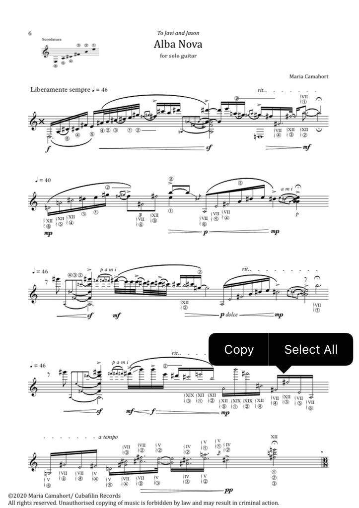 Alba Nova (New Dawn) is a composition for solo guitar created during the period of lockdown in Barcelona, due to Covid-19 (Spring 2020).The title itself expresses the search for hope in this uncertain period, and the sonorities of the piece are always trying to reflect light, positivity and determination.